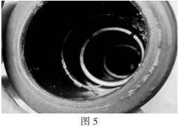 事故分支箱電纜終端所使用的硅脂密封功能不良,故障發(fā)生后,當(dāng)拆撥其它兩相電纜頭時(shí),由于硅脂出現(xiàn)干枯粘結(jié)(如圖5),需要多人合力才干撥出,可見硅脂已不能起到潤(rùn)滑防潮與絕緣的作用,不能與電纜頭同“呼吸”,彈性功能大為下降。
